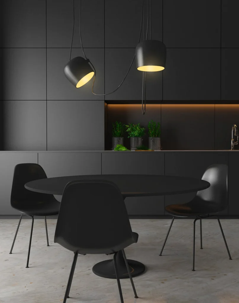 A bold modern kitchen with dark cabinetry and warm lighting.